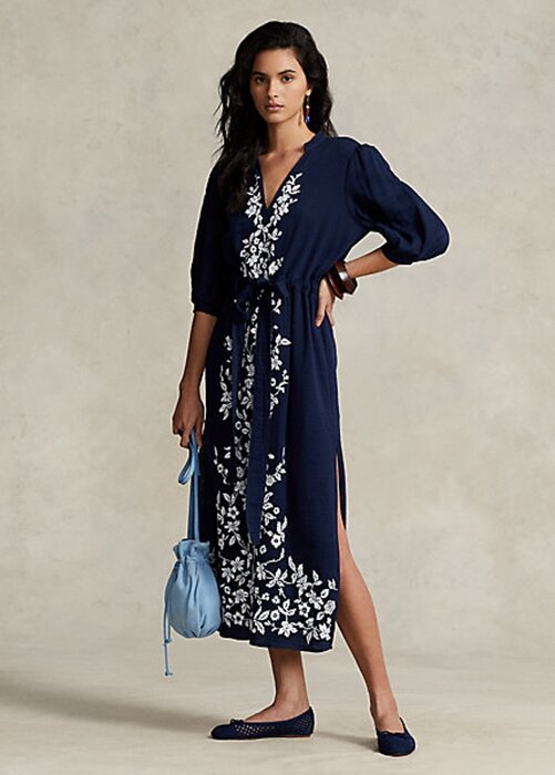 Navy Women’s Ralph Lauren Floral-Embroidered Gauze Maxidress Dress